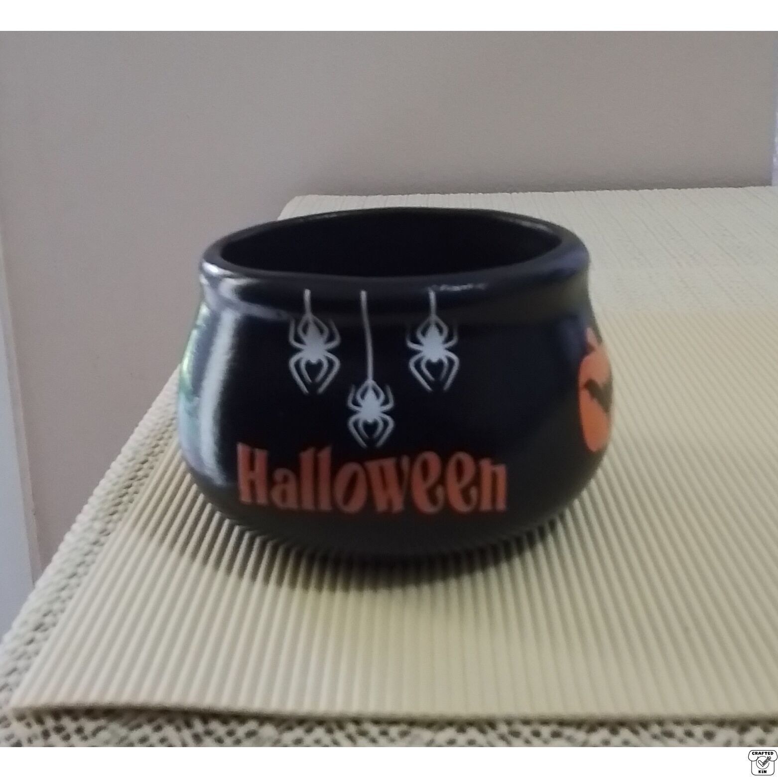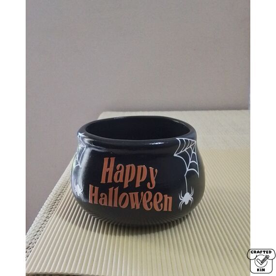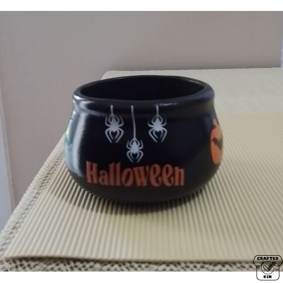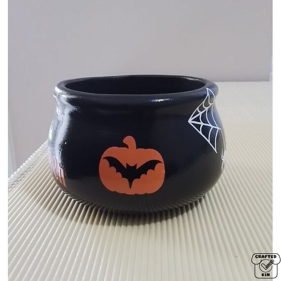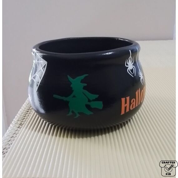 This piece has been poured, fired & cleaned by me, plus I have also hand painted the cauldron and have printed, weaved and placed all decals on the piece myself. It has been cleared with a gloss sealer so the decals should not come off or fade.